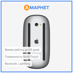 Беспроводная мышь Magic Mouse работает от встроенного аккумулятора и легко скользит по рабочей поверхности благодаря цельному основанию. Её поверхность Multi-Touch поддерживает простые жесты, например, позволяя переходить между веб-страницами и прокручивать документы с помощью смахивания.